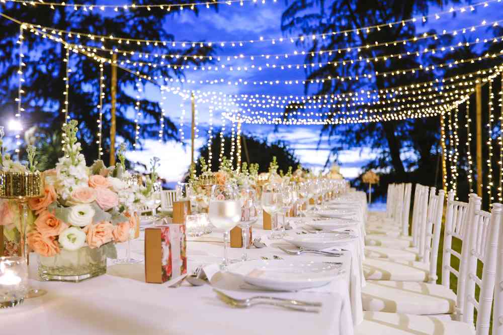 Dinner starts as soon as the doors to the ballroom are opened and your guests enter, not when food is served. It lasts one-and-a-half to two hours depending on the number of guests. It’s the “business” of your wedding.